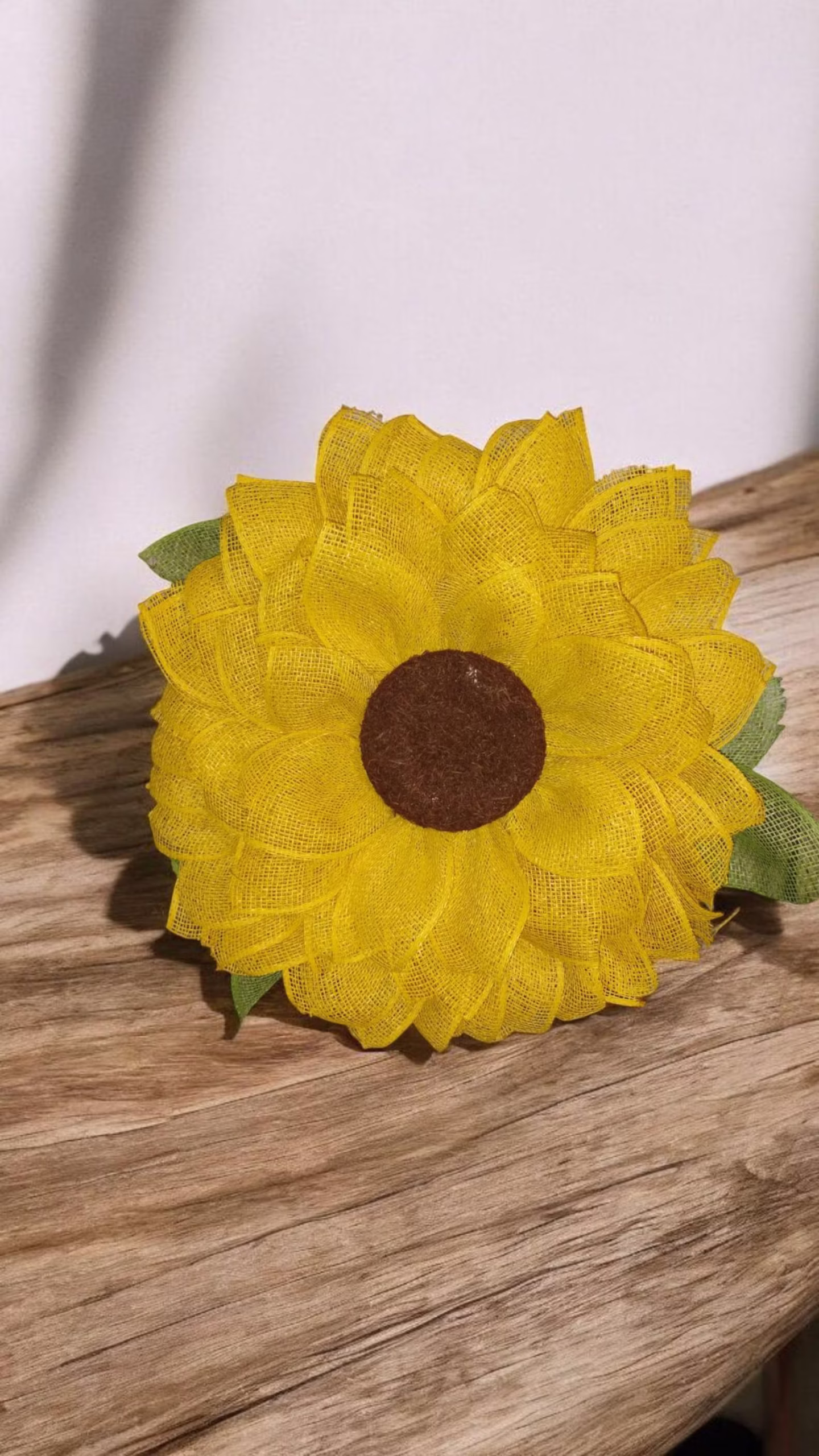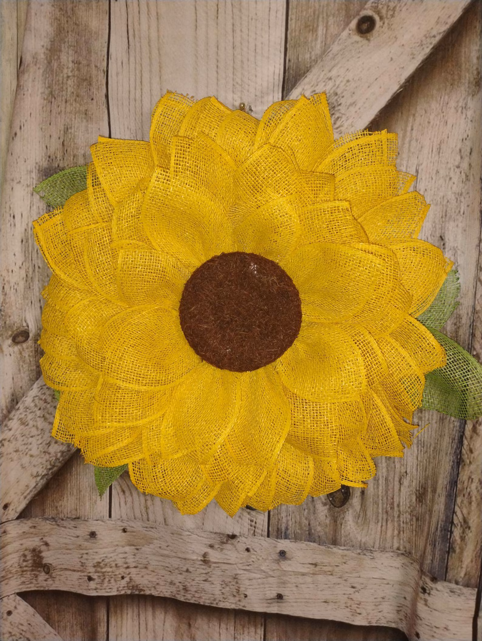 The DIY sunflower wreath is built up with layers of high-quality poly burlap mesh in cheerful yellows and leafy greens, finished with a brown flower center and contrasting texture for natural depth. The handmade craftsmanship in the wreath ensures every twist of mesh and curve of each burlap petal will catch the light perfectly to convey the feeling of a fresh sunflower under a spring sky.