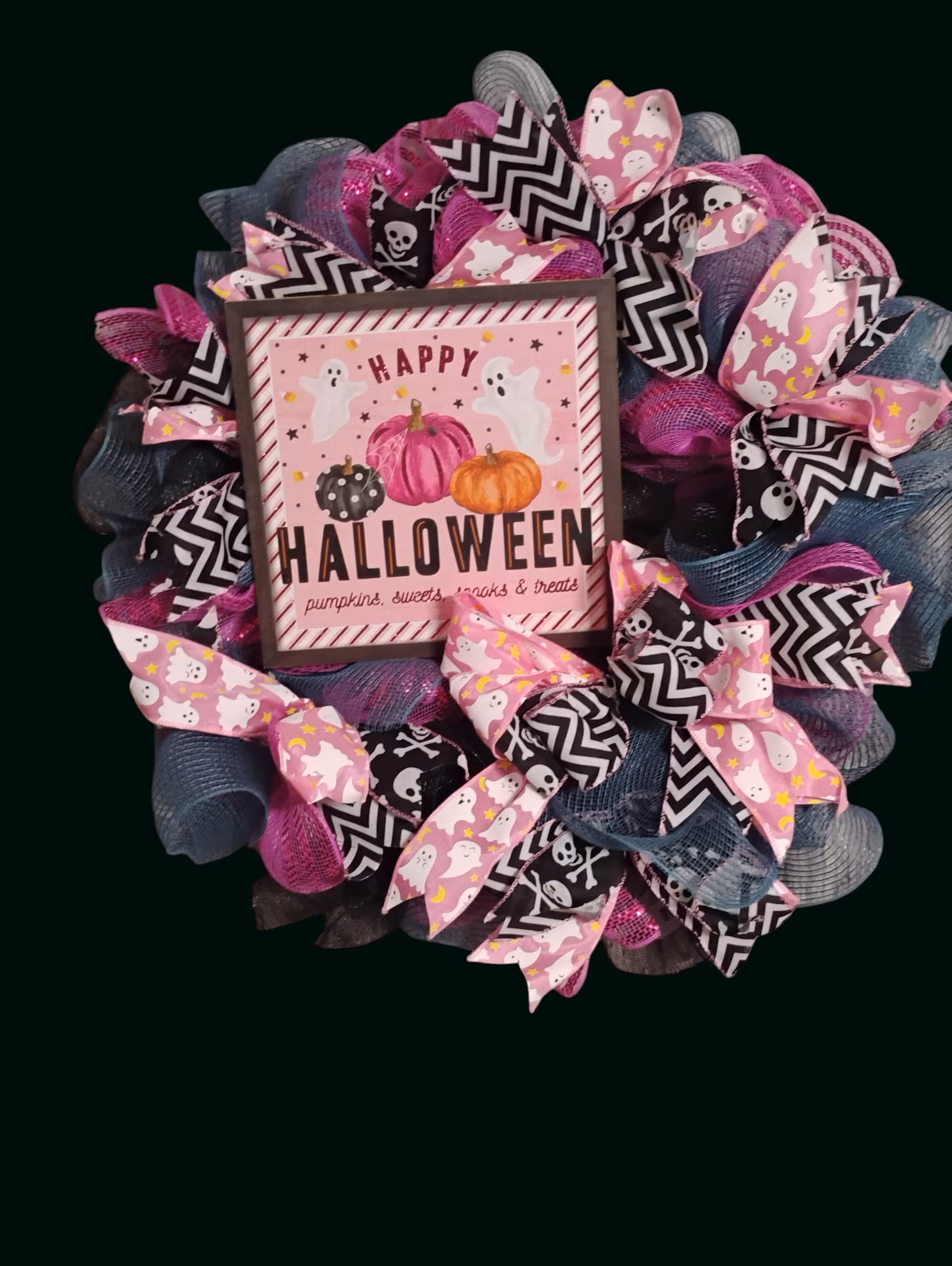 Pink & Gray Halloween Wreath – Spooky Ghost Deco Mesh Door Decor